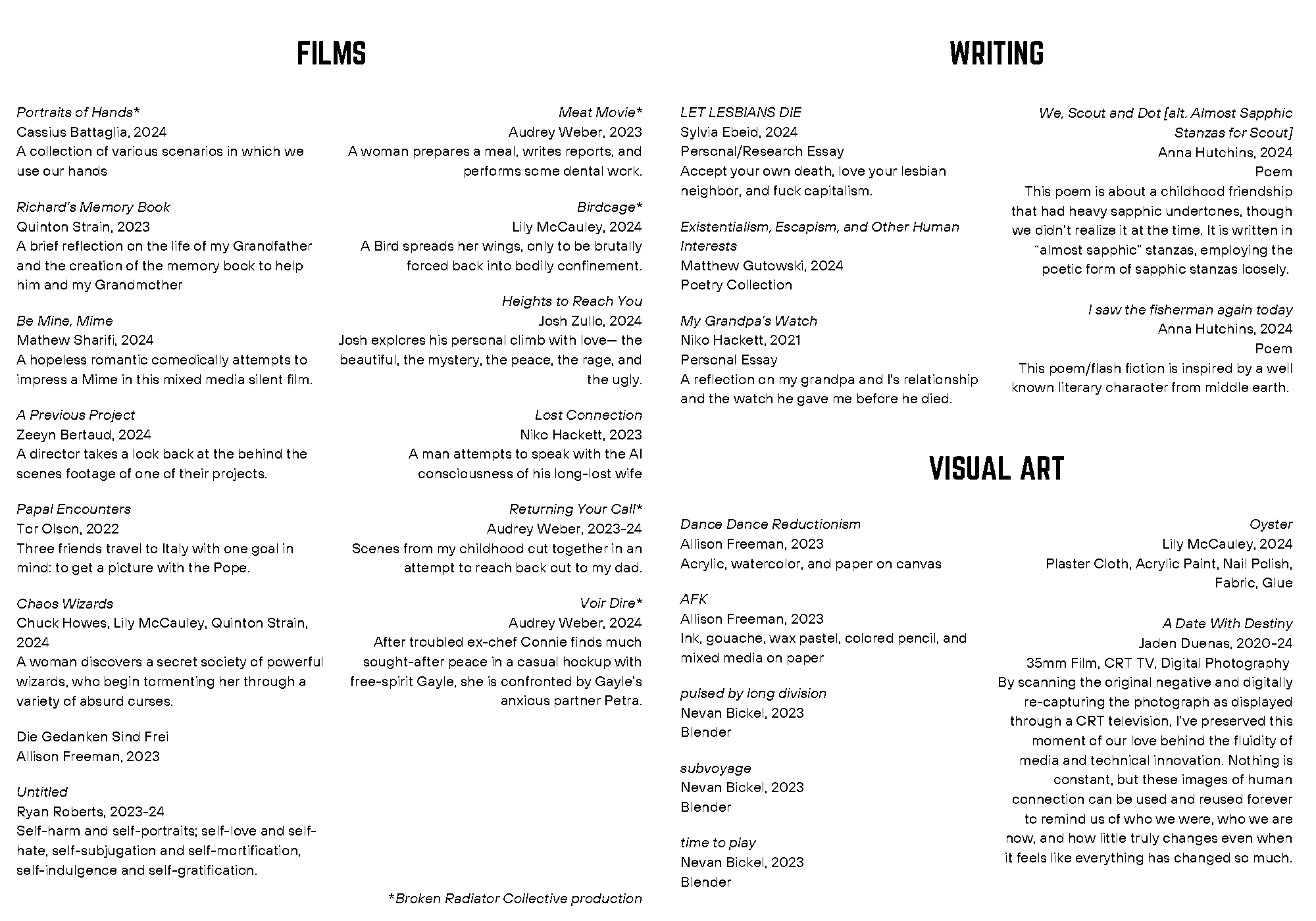 The first iteration of our FINAL DRAFTS exhibitions, featuring a mixed medium gallery, showcase of writing, & film screenings.