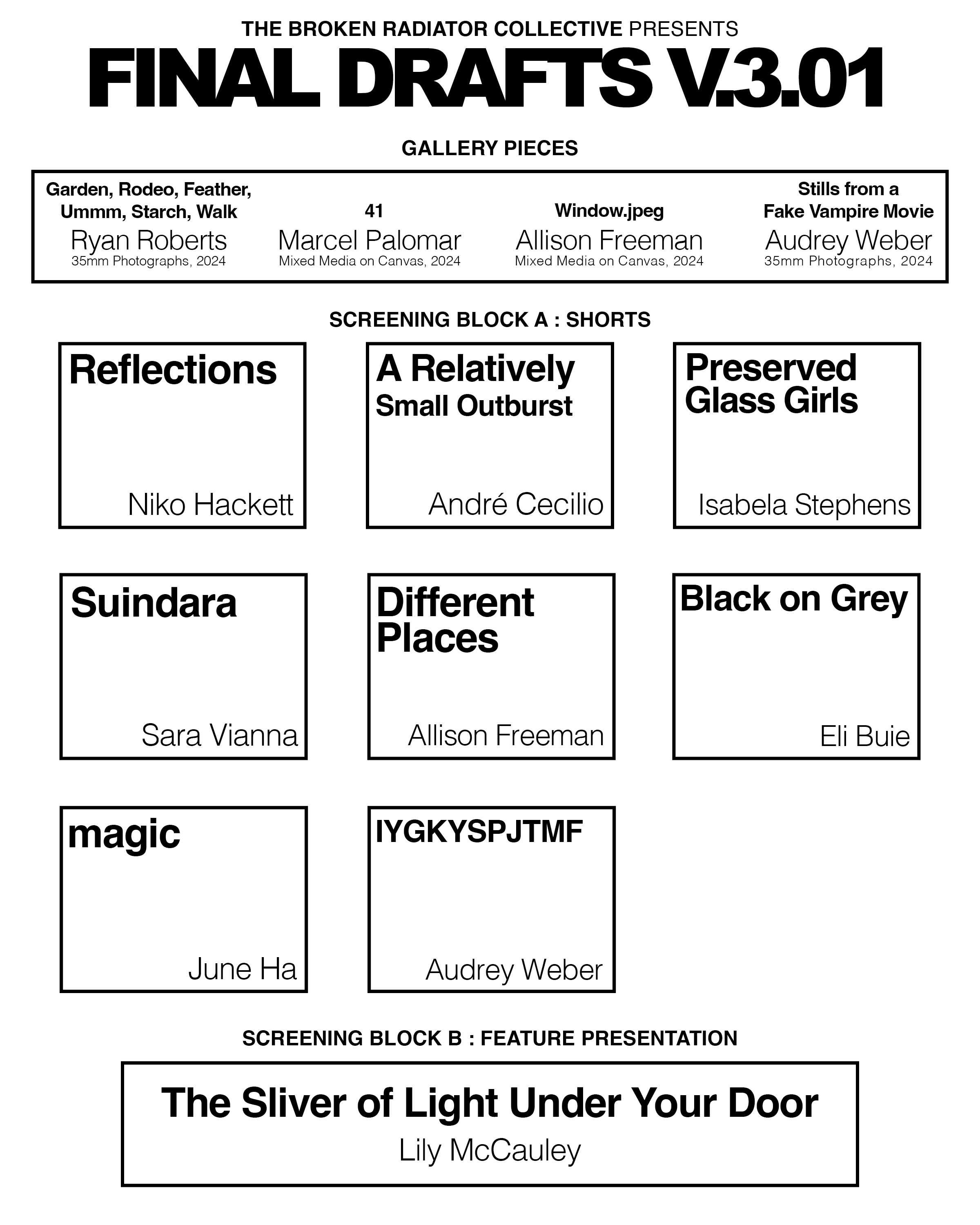 The third iteration of our FINAL DRAFTS exhibitions, featuring a mixed medium gallery & film screening with an emphasis on pieces making their debut appearance.